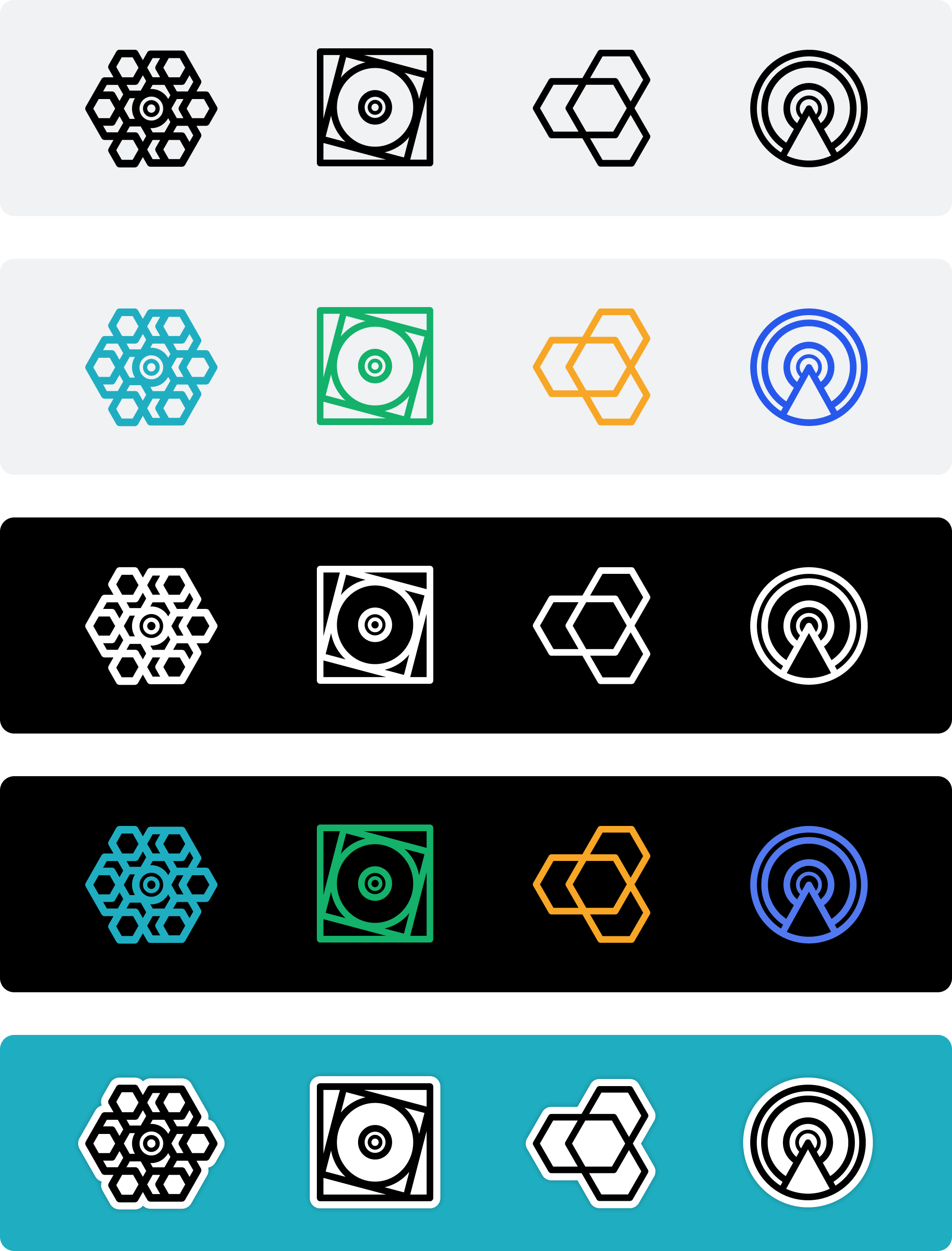 Because the each logo had been created over time, they no longer worked consistently as a family. On the left you can see differences in line weight, proportions, corner radius, which all made the suite feel mismatched. The redesign on the right focused on alignment rather than reinvention so the system felt more unified, scalable and considered.